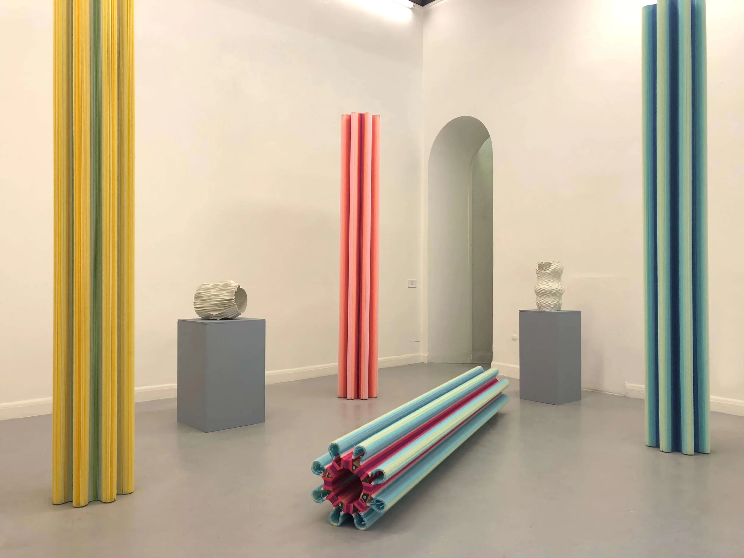 Sono forme astratte che ricordano le sembianze dei fusti di colonne classiche striate senza condividere con esse alcun aspetto strutturale. Non supportano alcun peso e non definiscono alcuno spazio, se non quello creatosi dal vuoto intorno a loro. L’artista ci immerge in un environment più vicino al concetto di ambiente che di spazialità. La loro disposizione può apparire simile alle Two Columns di Robert Morris, un artista con cui Matteo Nasini si è confrontato anche nell’ultima mostra a Palazzo Fortuny a Venezia.