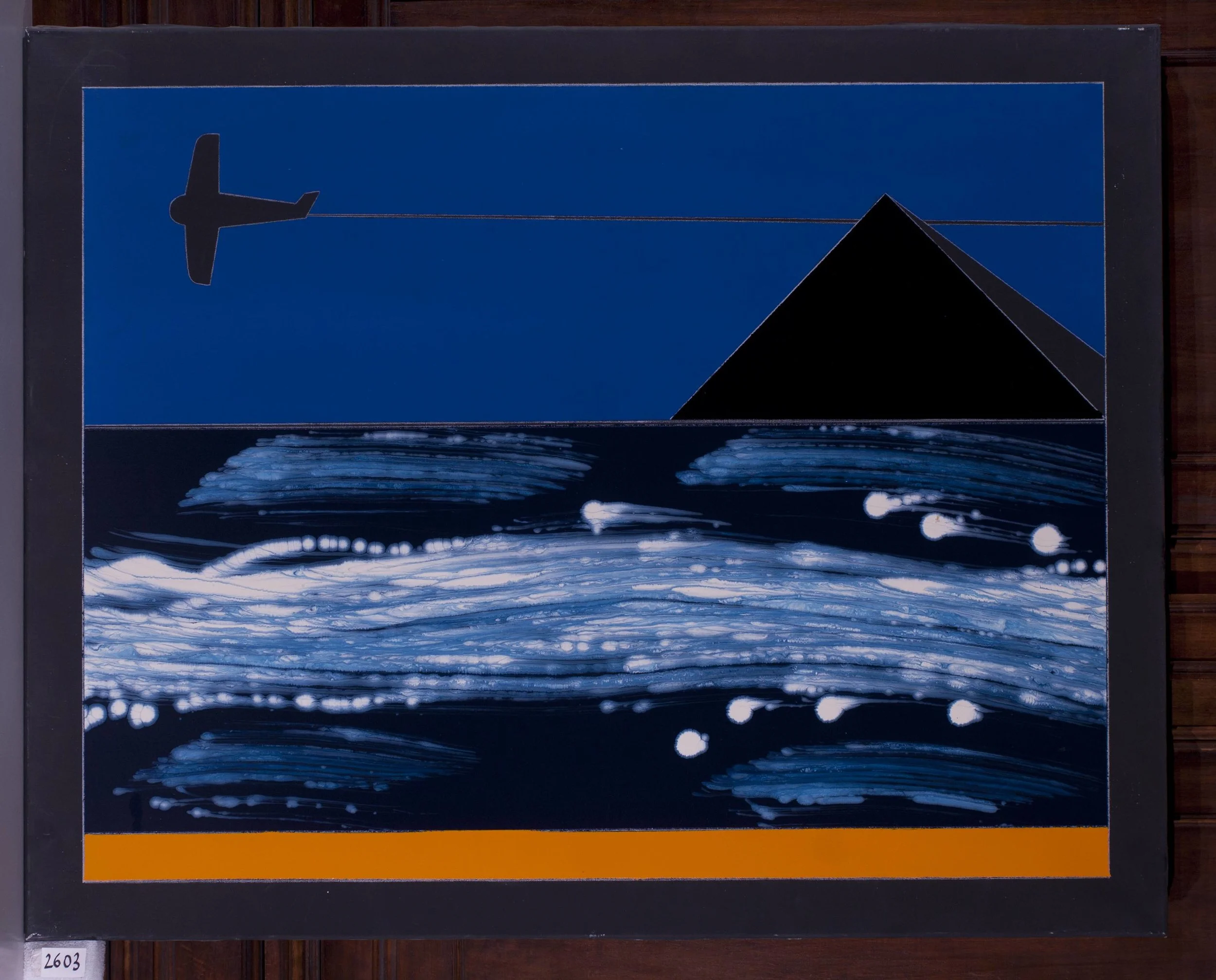 Nei lavori di Franco Angeli tornano invece i simboli tipici degli anni ’60 dalla falce e martello all’aquila usata nei suoi half dollar. Interessante, oltre che curiosa, la fotolitografia composta da diversi negativi colorati: un richiamo alla produzione filmica e fotografica dell’artista che, proprio insieme a Tano Festa, provò a lavorare in modo sperimentale con la cinepresa. Alle tecniche miste su carta è accostata l’opera su tela “Velieri” in cui, in assenza di prospettiva, vediamo un paesaggio sognante dove vicino ad uno spicchio di luna volano degli aeroplani e un veliero naviga sul mare. La terra ferma in primo piano ospita invece un altro simbolo caro all’artista: una piramide.