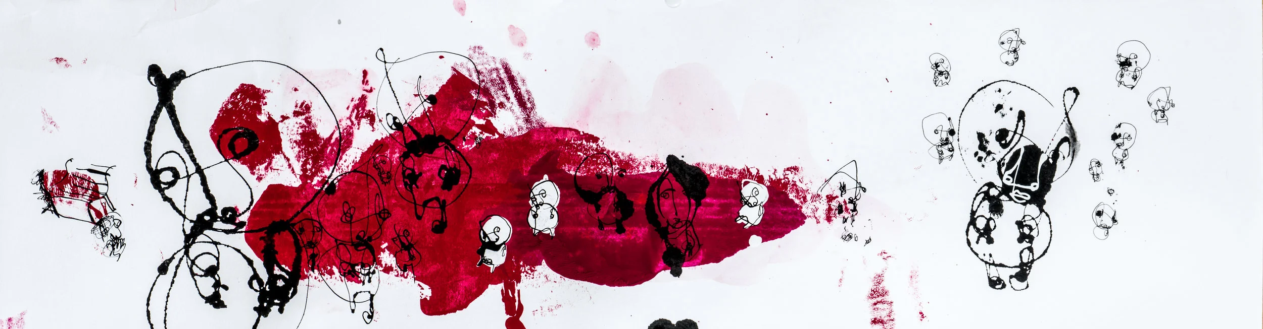 Con un segno pittorico a primo sguardo astratto ma denso di narrazioni silenziose, Bucchi in Paesaggio Sospettato ci introduce in una dimensione “altra”, in cui una figurazione appena accennata parla direttamente all’inconscio dello spettatore. Come in uno screen playsurrealistico, i sei pannelli - indipendenti e sciolti da una lettura spazio-temporale - sembrano restituire un intimo flusso di coscienza. In un’alternanza di piani, ominidi iconici del linguaggio dell’artista, assimilabili alla tradizione novecentesca dell’automatismo psichico, abitano un “paesaggio” intervallato da violenti tocchi di rosso e puntellati da accenni alla vita domestica. Apparentemente ludico ma a tratti inquietante, il lavoro di Danilo Bucchi è insieme onirico e realistico concedendo allo spettatore il potere dell’interpretazione e magari dell’immedesimazione.